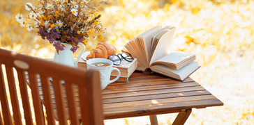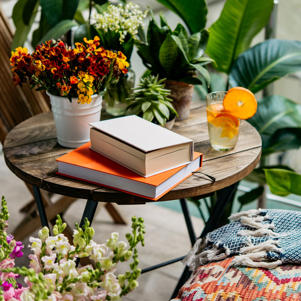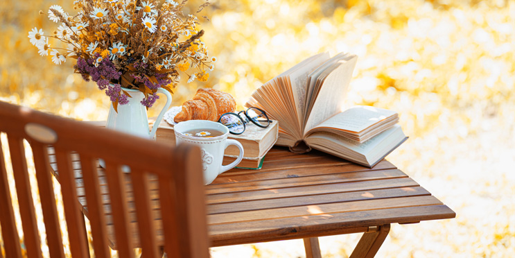 Gemütliche Gartenwelten schaffenBild: Kleiner Tisch mit Pflanzen, Buch und Stuhl.