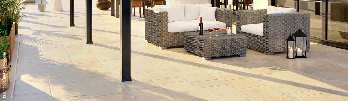 Grundsätzlich sind Terrassenplatten angenehm pflegeleicht. Schmutz bleibt dank der geringen Porosität an der Oberfläche und kann in aller Regel sehr einfach entfernt werden. Meist ist bereits der Einsatz eines Kehrbesens ausreichend. Zur Not können Sie mit Wasser nachhelfen, eventuell unter Zuhilfenahme von handelsüblichen Haushaltsreinigern. Eine lose Verlegung – also ohne empfindliche Fugen – ermöglicht zudem den problemlosen Einsatz eines Hochdruckreinigers.