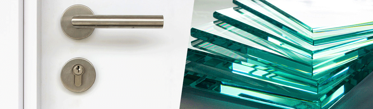 Zweigeteiltes Bild mit Darstellungen rund um die Tuer, links Tuerdruecker und Tuerschloss, rechts Glasfenster auf einem Stapel