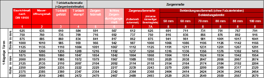 Tabellarische Uebersicht der Tueren-Standardmasse bei einfluegeligen Tueren bezogen auf Aspekte wie Tuerblattaussenmasse, Zargenmasse, Baurichtmasse und Maueroeffnungsmass Bild: Tabellarische Aufstellung von Standardhöhe und Standardbreite in mm für 1-flügelige Türen. Berücksichtigt werden das Baurichtmaß nach DIN 18100, das Maueröffnungsmaß, Die Türblattaußenmaße bzwl Zargenbestellmaße sowie die Zargenmaße (Zargenfalz, Zargendurchgangsmaß, Zargenaußenmaße, Bkleidungsaußenmaß).
